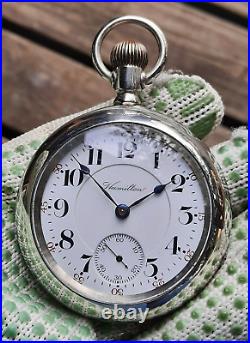 The Elgin 16s, Model 3 pocket watch is a vintage timepiece with a beautifully engraved silver case, featuring a white dial and 11 jewels. Manufactured in 1888, this manual mechanical movement pocket watch is a piece of history for collectors and enthusiasts of vintage timepieces. The train engraving on the case adds a unique and decorative touch to this classic Elgin pocket watch.